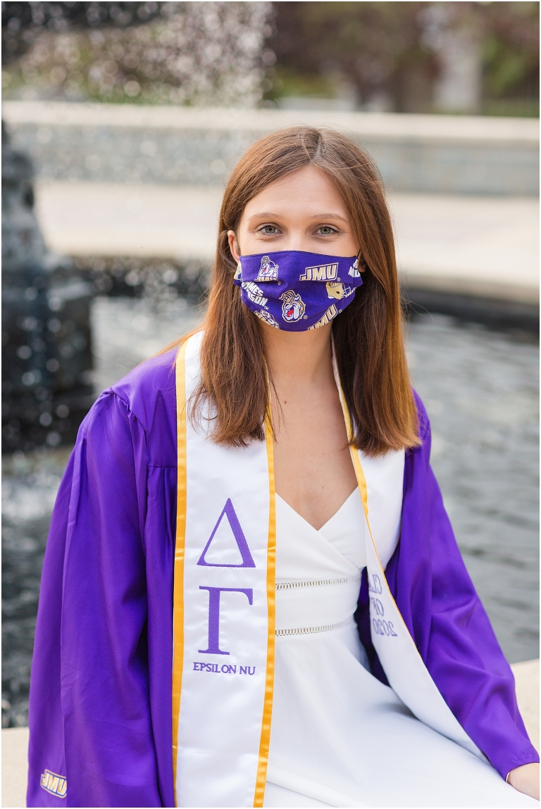 Katie celebrated graduation early this fall with JMU graduation portraits! The campus was empty, the flowers were in full bloom, and the light was gorgeous. She brought along her boyfriend and her two best college friends for support. We got a bunch of pictures of Katie alone as well as group shots with her girls and her man. We made sure to get special shots of their JMU face masks so they can remember this crazy season of Covid!